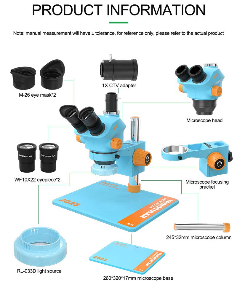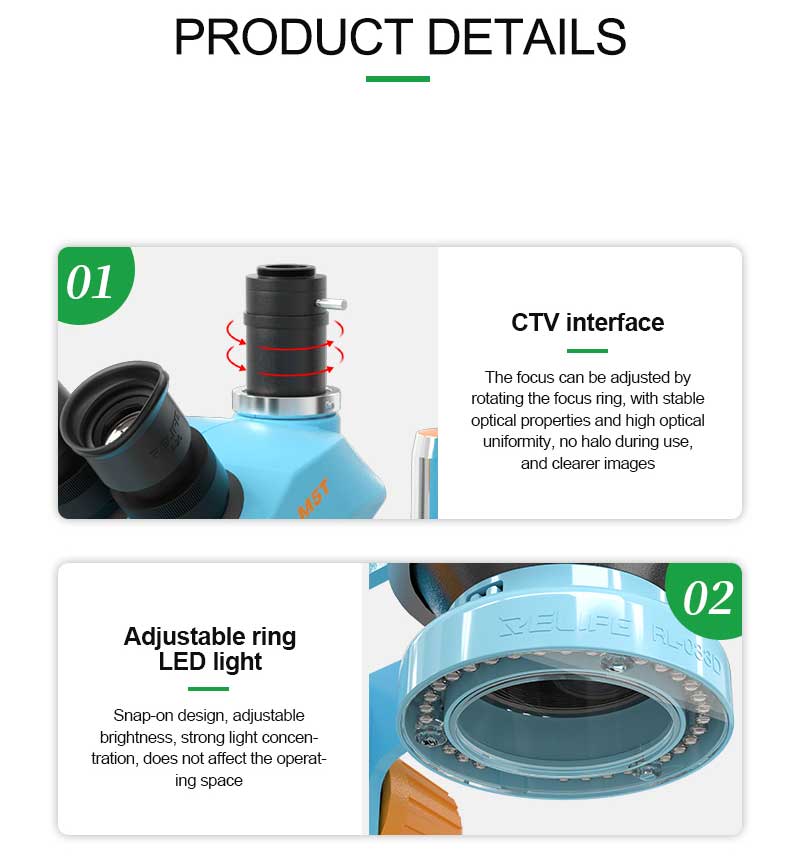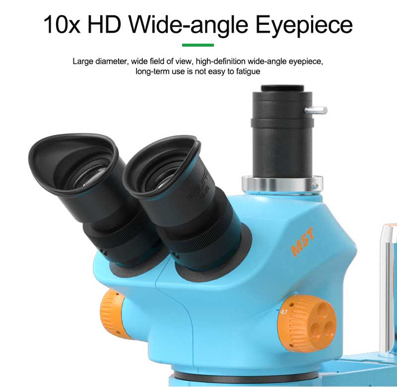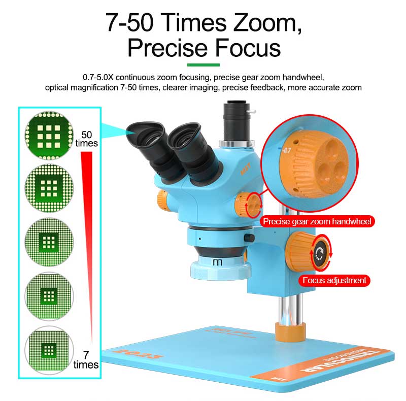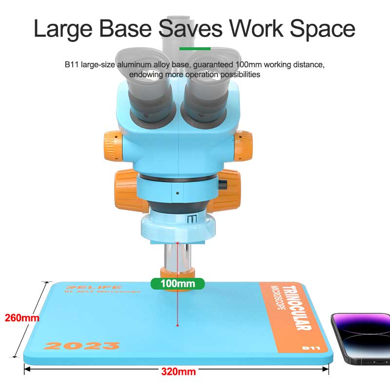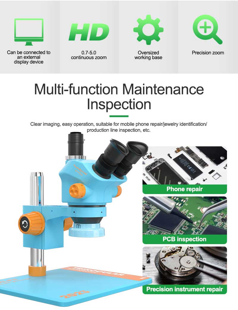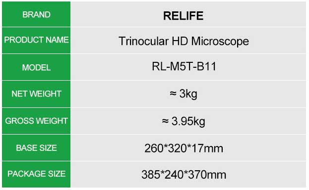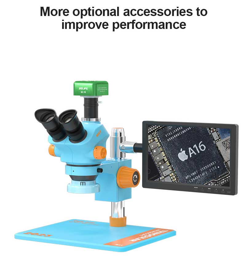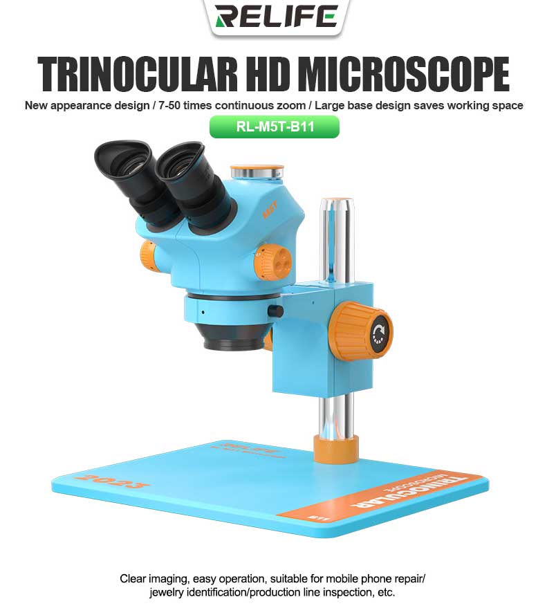 Relife RL-M5T-B11 RL-M5T Pro-B11 7-50X continuous zoom HD optical trinocular microscope for smart phone, tablet and laptop PCB repairing, micro-soldering tool. It's easy to operate, suitable for devices repair/jewelry identification/production line inspection, etc.