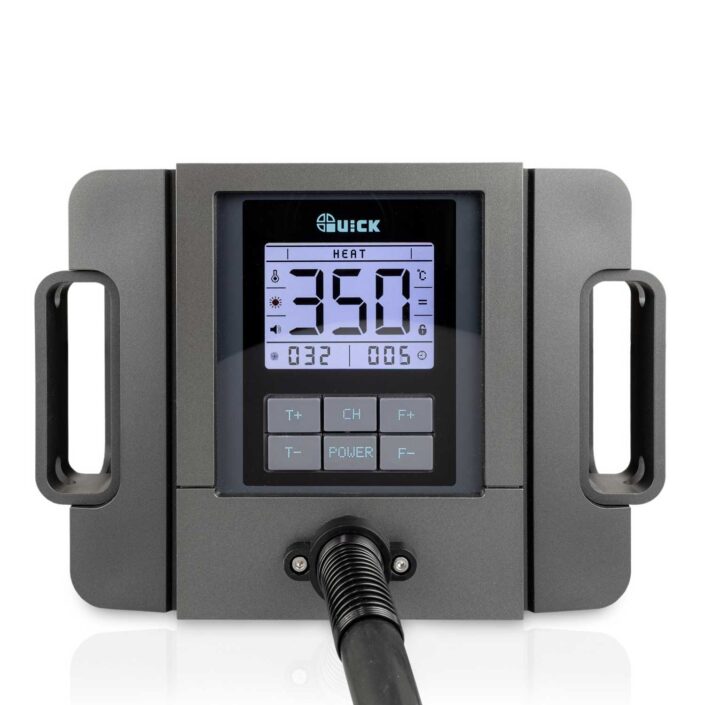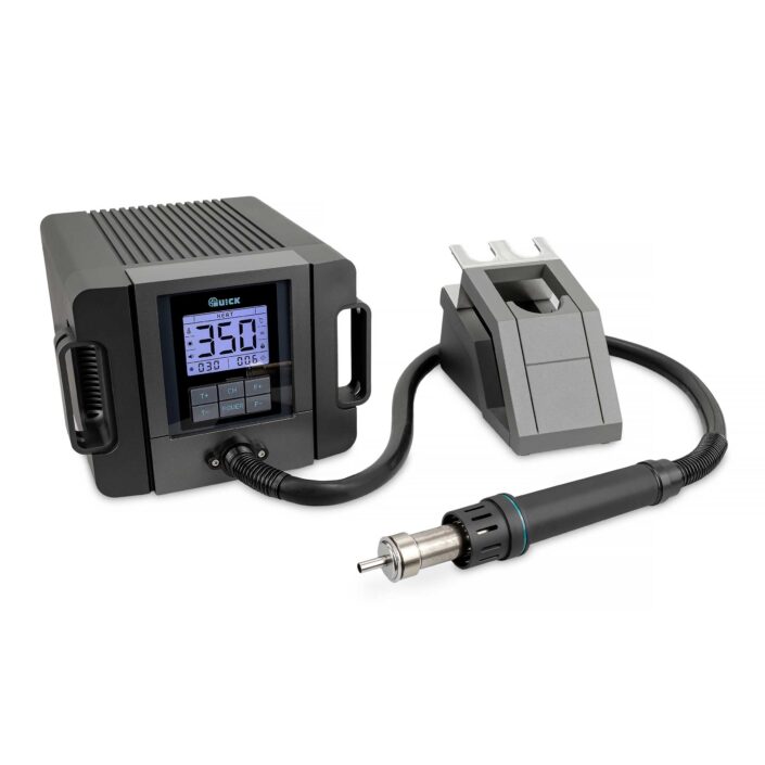 Advanced Hot Air Rework Station with a 1300 W heating power. Designed for professional soldering electronic components using lead-free solders. This Quick soldering station has a new design LCD display and easy to use buttons to digitally set the parameters.