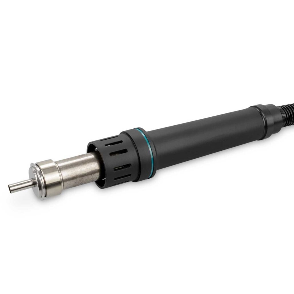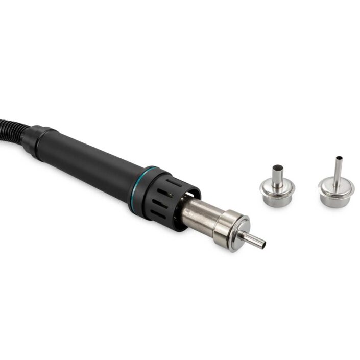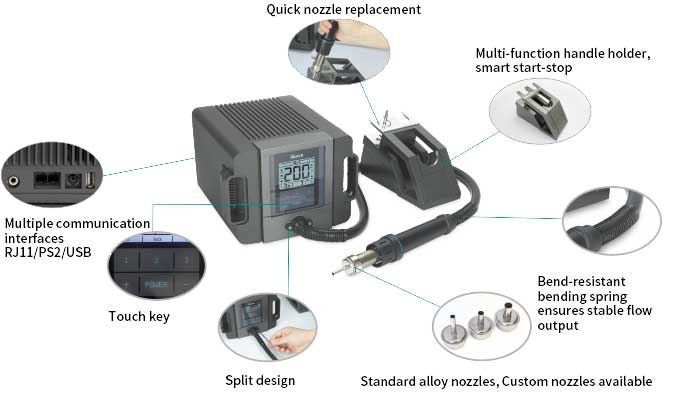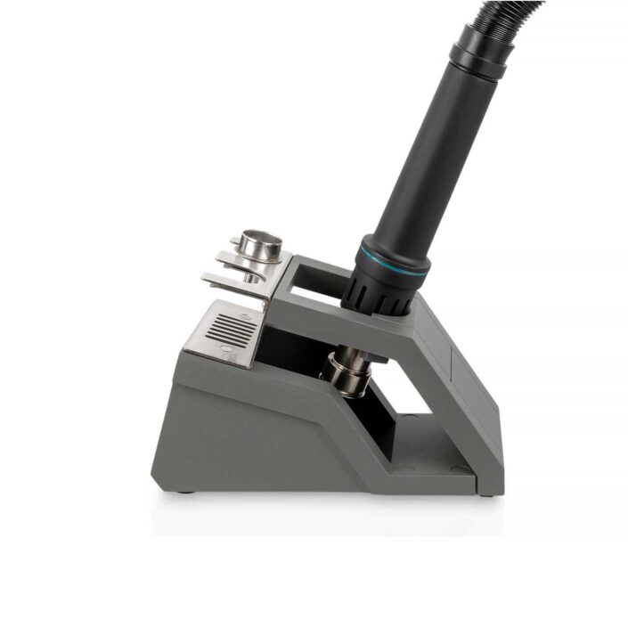 New model of ESD safe, professional Hot Air Rework Station with a 1300 W heating power. Temperature adjustment from 100 °C to 500 °C. High temperature stability.