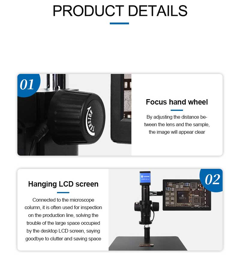 - Hanging LCD screen, connected to the microscope column, it is often used for inspection on the production line, solving the trouble of the large space occupied by the desktop LCD screen, saying goodbye to clutter and saving space
