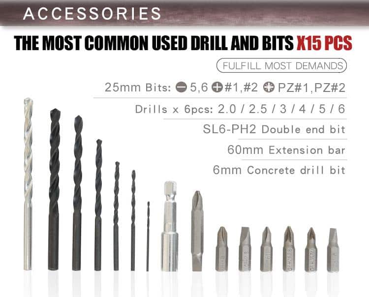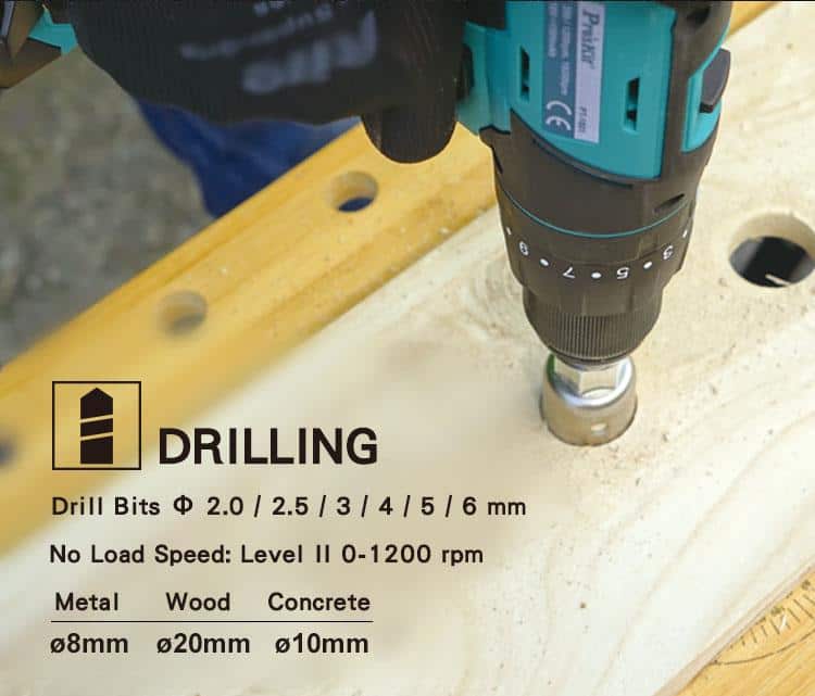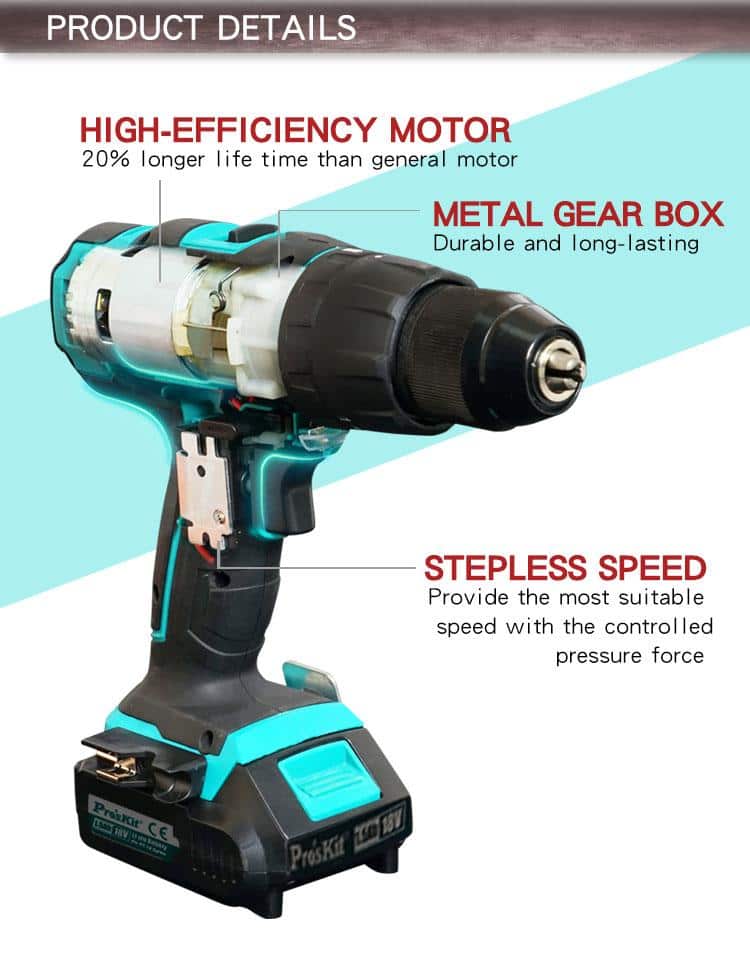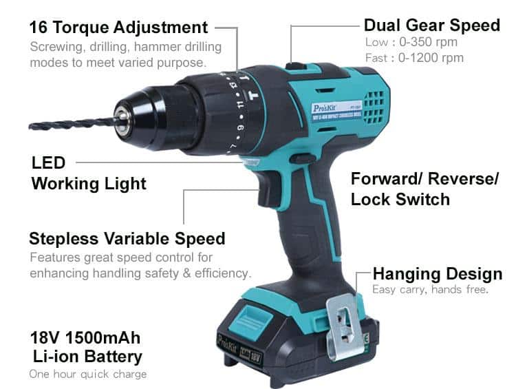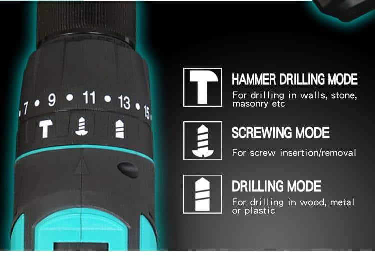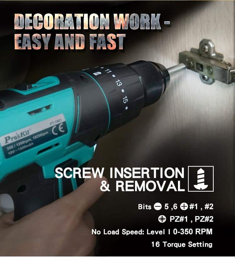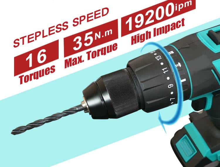 - – 16 adjustable torque settings for screwing, and extra 3 position for drilling purpose.