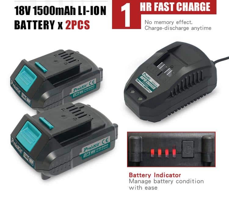 - – Comes with 18V /1.5 Ah li-ion battery pack which provides longer run-time and quick recharging time in about 1 hour.