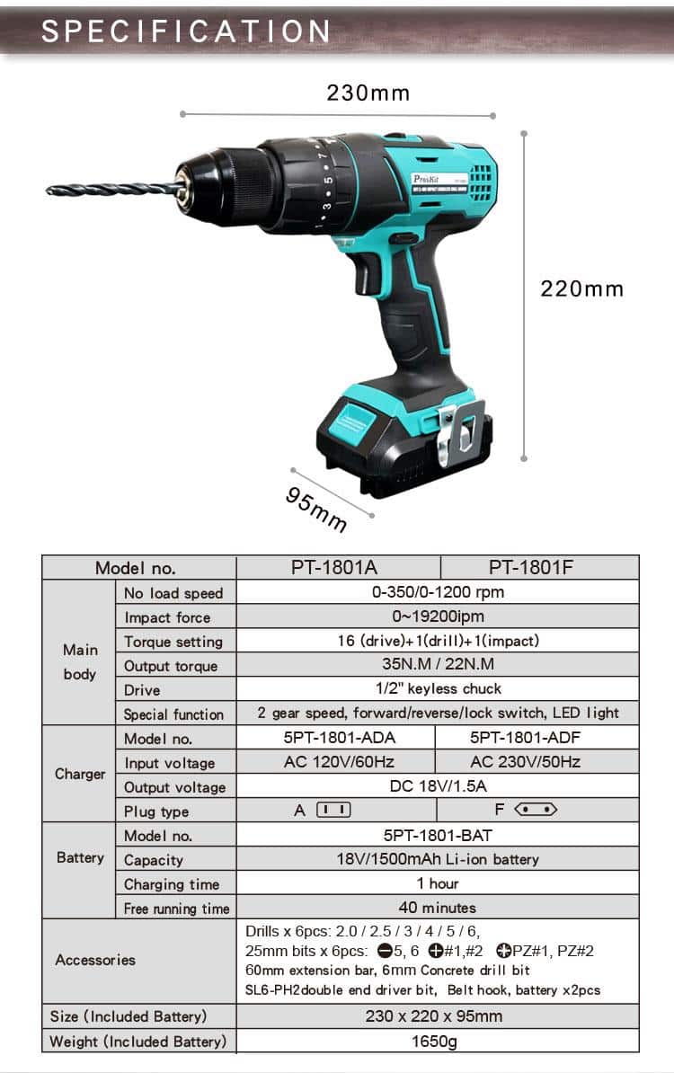 PT-1801F 18V Li-Ion Impact CordlessDrill Driver
