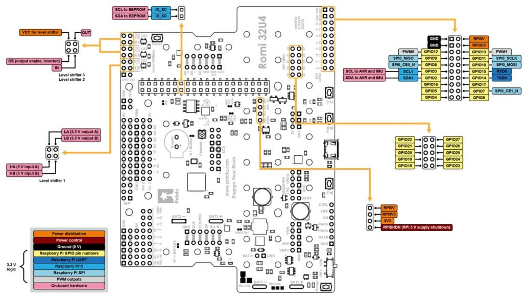 - The Motor Driver and Power Distribution Board for Romi Chassis includes the same motor drivers and power circuit (including 5 V regulator) as the Romi 32U4 Control Board, but offers you flexibility in choosing and connecting your own microcontroller.
